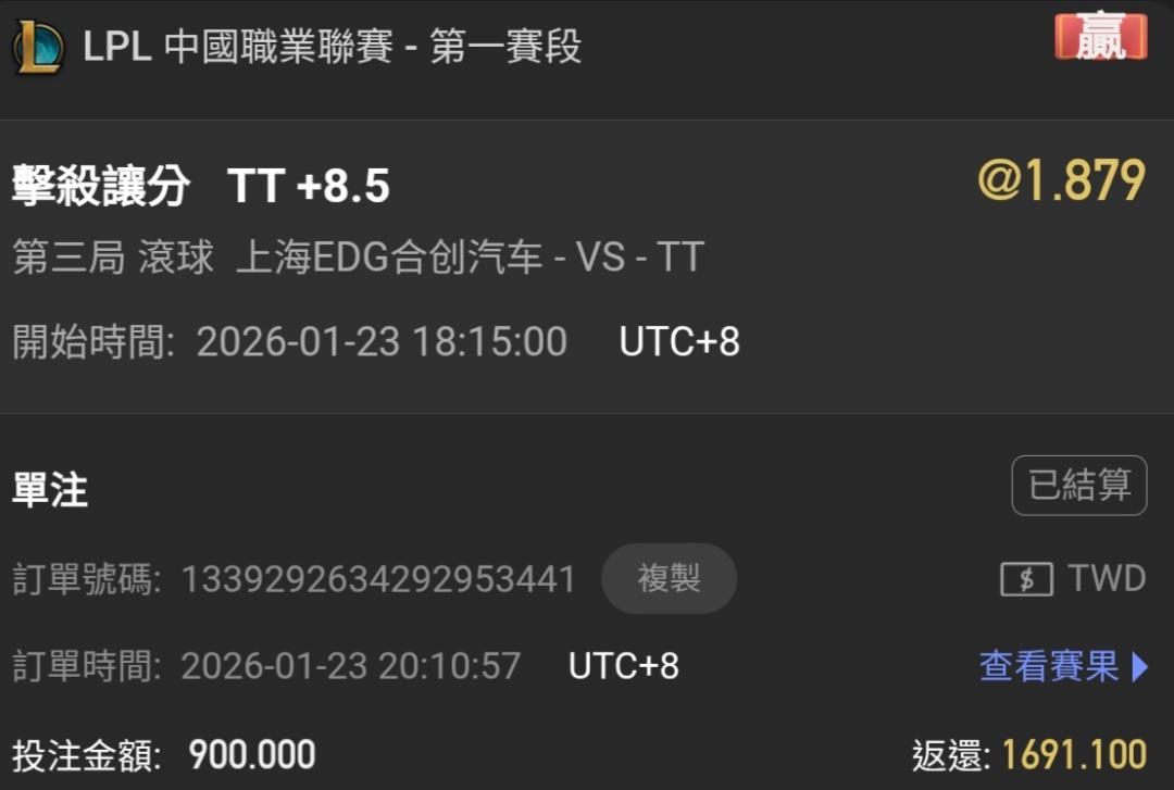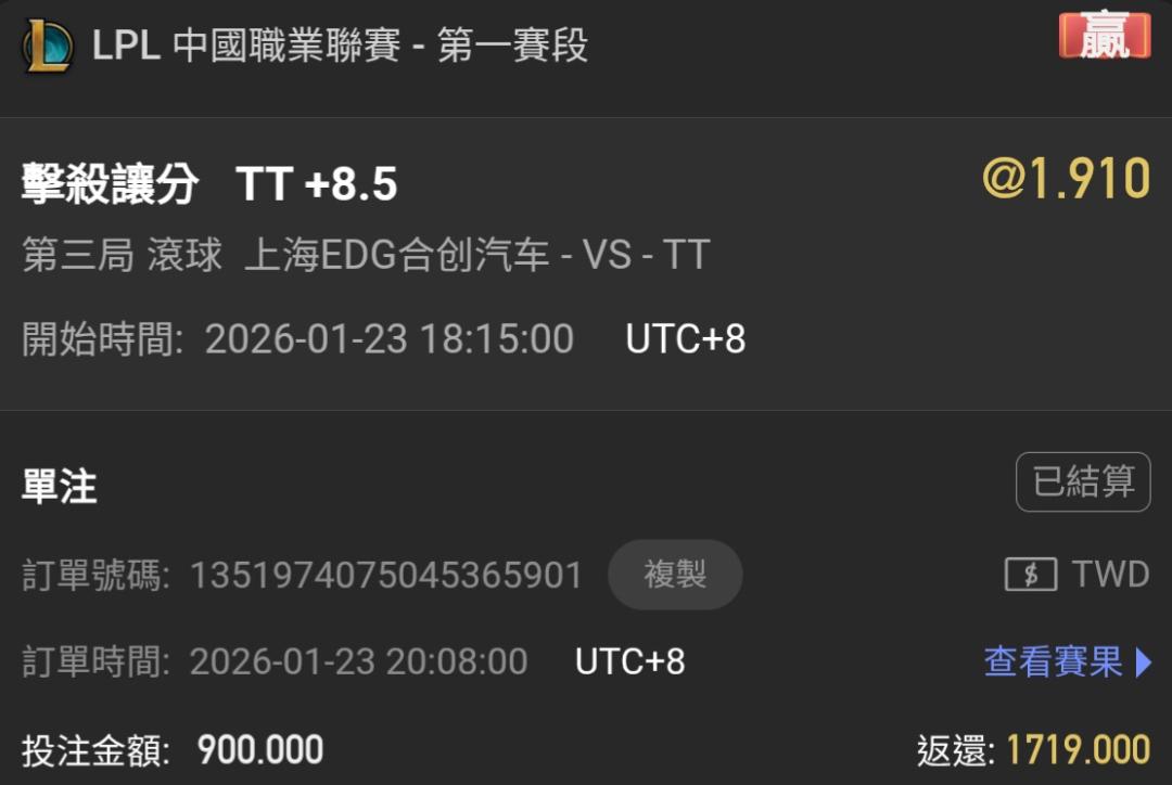 因為感覺EDG-8.5 跟 TT+8.5 賠率都蠻曖昧不明⋯所以相信TT人頭+號一下~