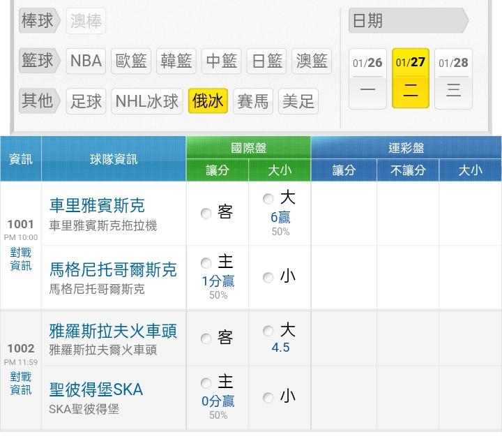 俄羅斯冰球 >> ⭐⭐1/27俄冰盤口
