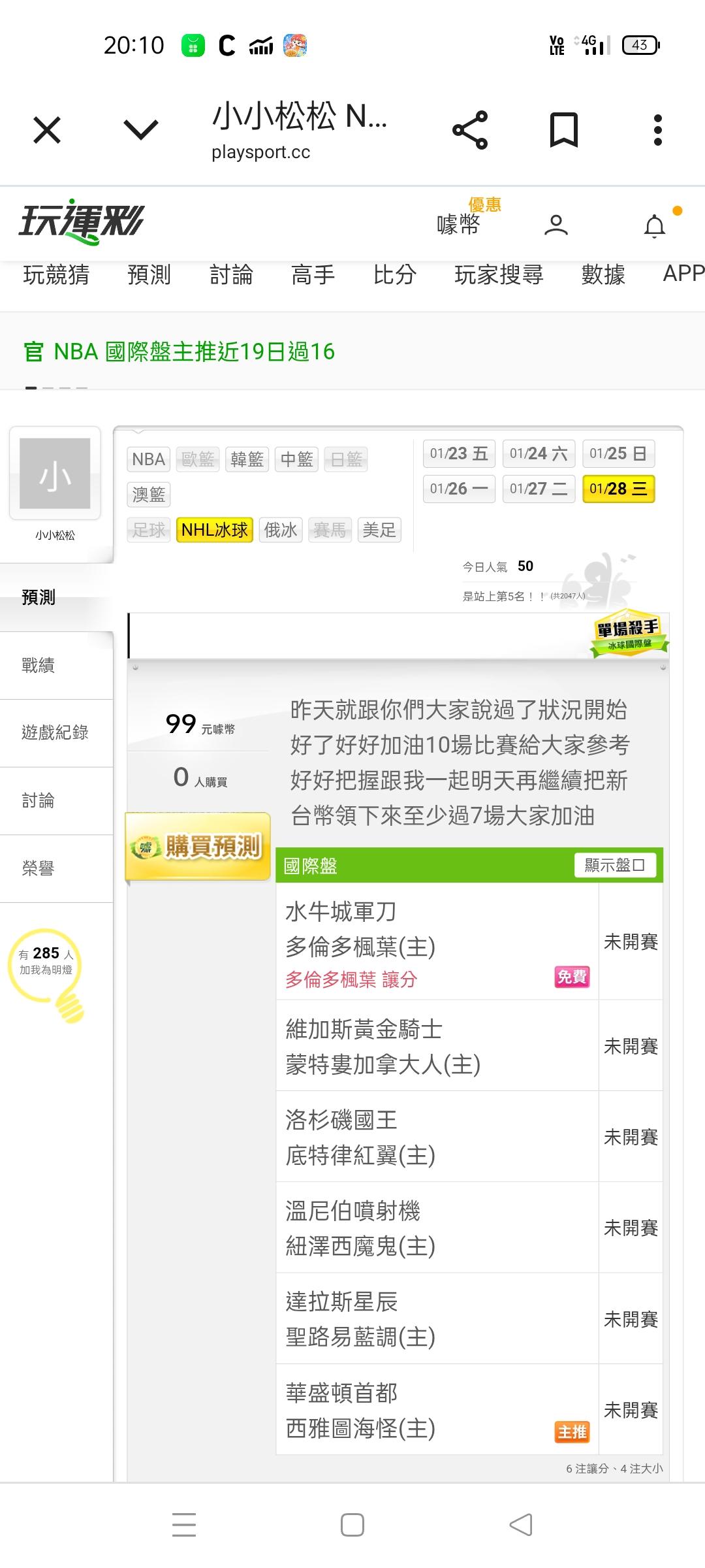 NHL冰球 >> 明天10場比賽至少要過七場以上非常有信心會過7場以上相信我的買下去準沒錯分批投資穩定獲利一起加油吧