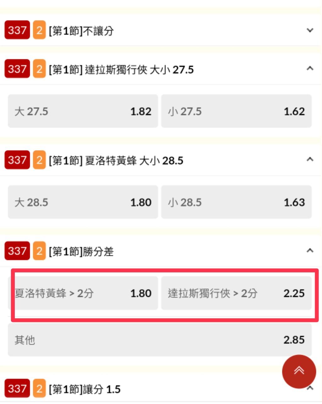 每1節都有勝分差可以買 就是兩隊的分數差距 大於2分就算中 選對隊伍就行 選對隊伍很容易中這格 |