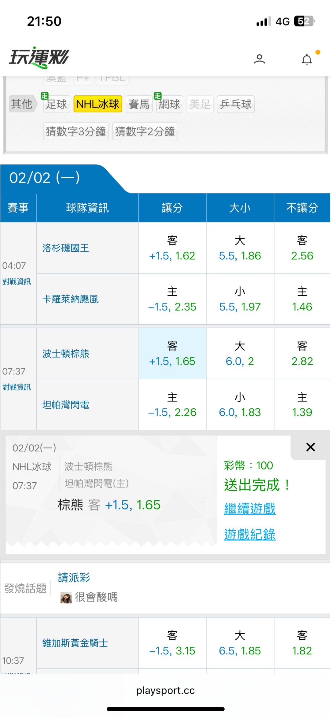>> 2/2東台NHL國際盤【連贏4天16過10】主推信心滿滿(貓場)特價79-拼NHL國際連贏5天~
