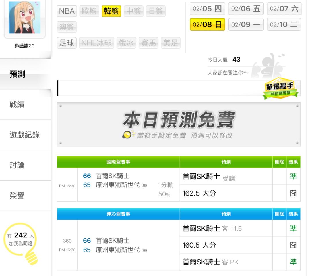 韓國職籃 >> 2/9 上週六3過2 昨日2過1 ,今日繼續特價