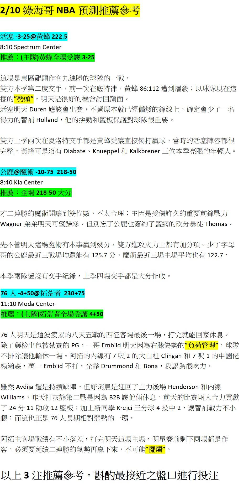 >> 2/10 綠海哥NBA三場預測參考。單純分享,輸贏自負。(留言無回覆,見諒)