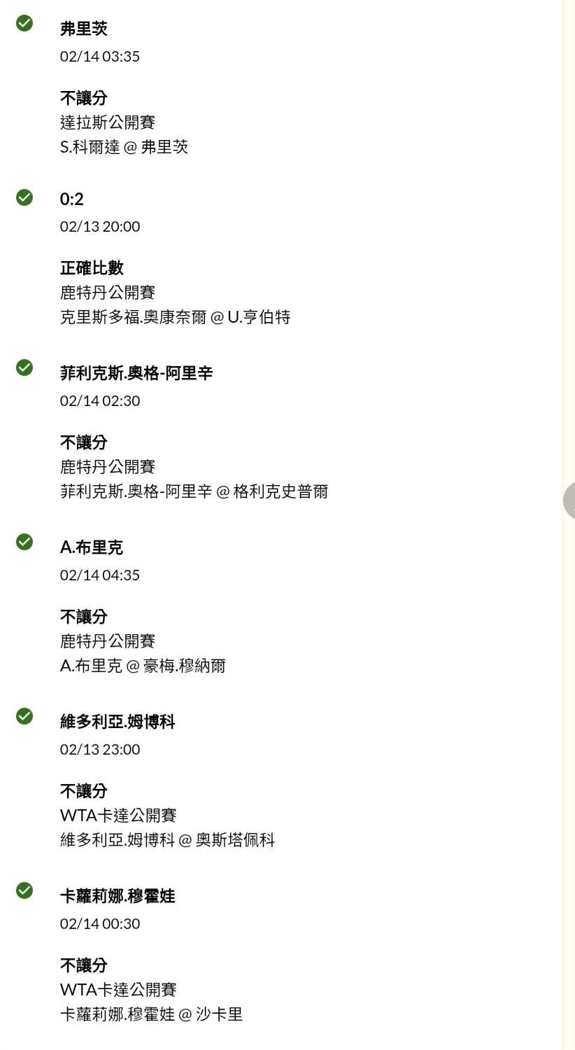 網球 >> 2/14〈網球〉ATP、WTA-各種公開賽