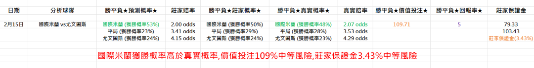 足球 >> (02/15) 運彩:不讓分單場★意甲★ (數學足球模型、科學精算分析、輸贏自負、沒有絕對)