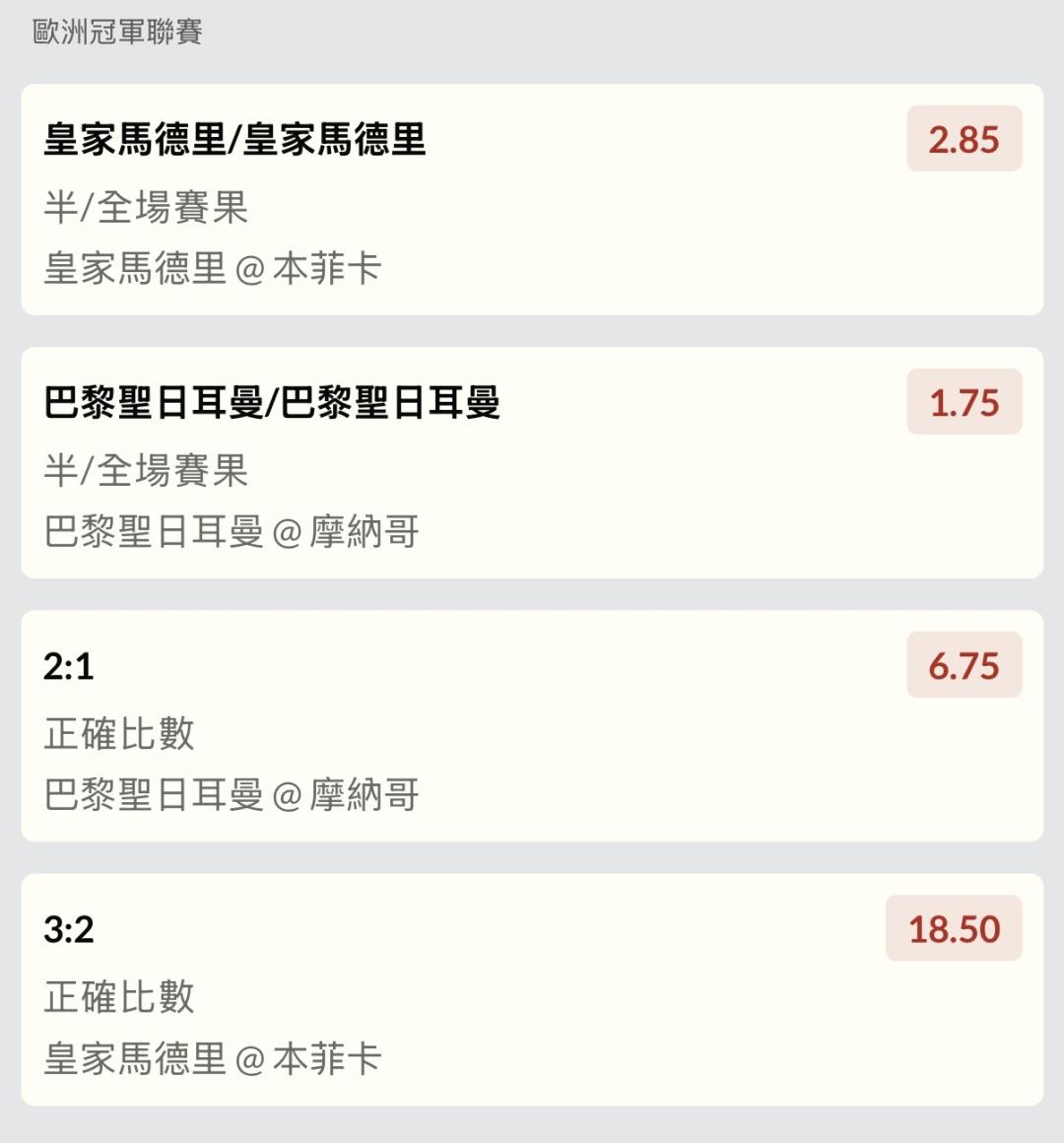 皇馬上半1:0 2:0 全場3:2 日耳曼2:0 全場2:1
