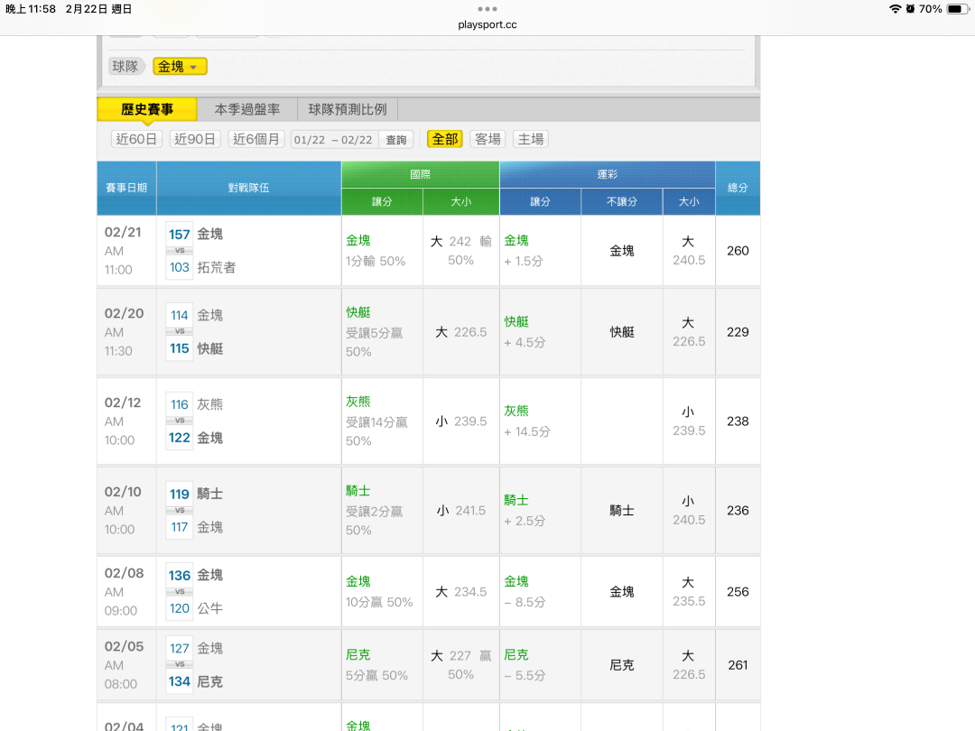 2/20面對快艇,不太記得⋯⋯好像是快艇讓1,盤分走勢最終變金塊讓5,差蠻多的,賽果快艇贏1,金塊又輸球輸盤