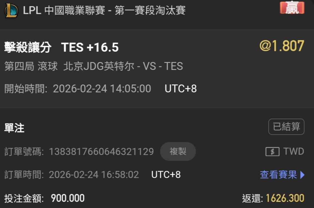 我剛才走地買TES+16.5 看看能不能過?!