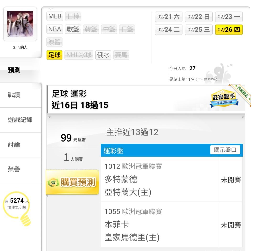 足球 >> 近16日18過15【主推13過12】玩的還不錯
