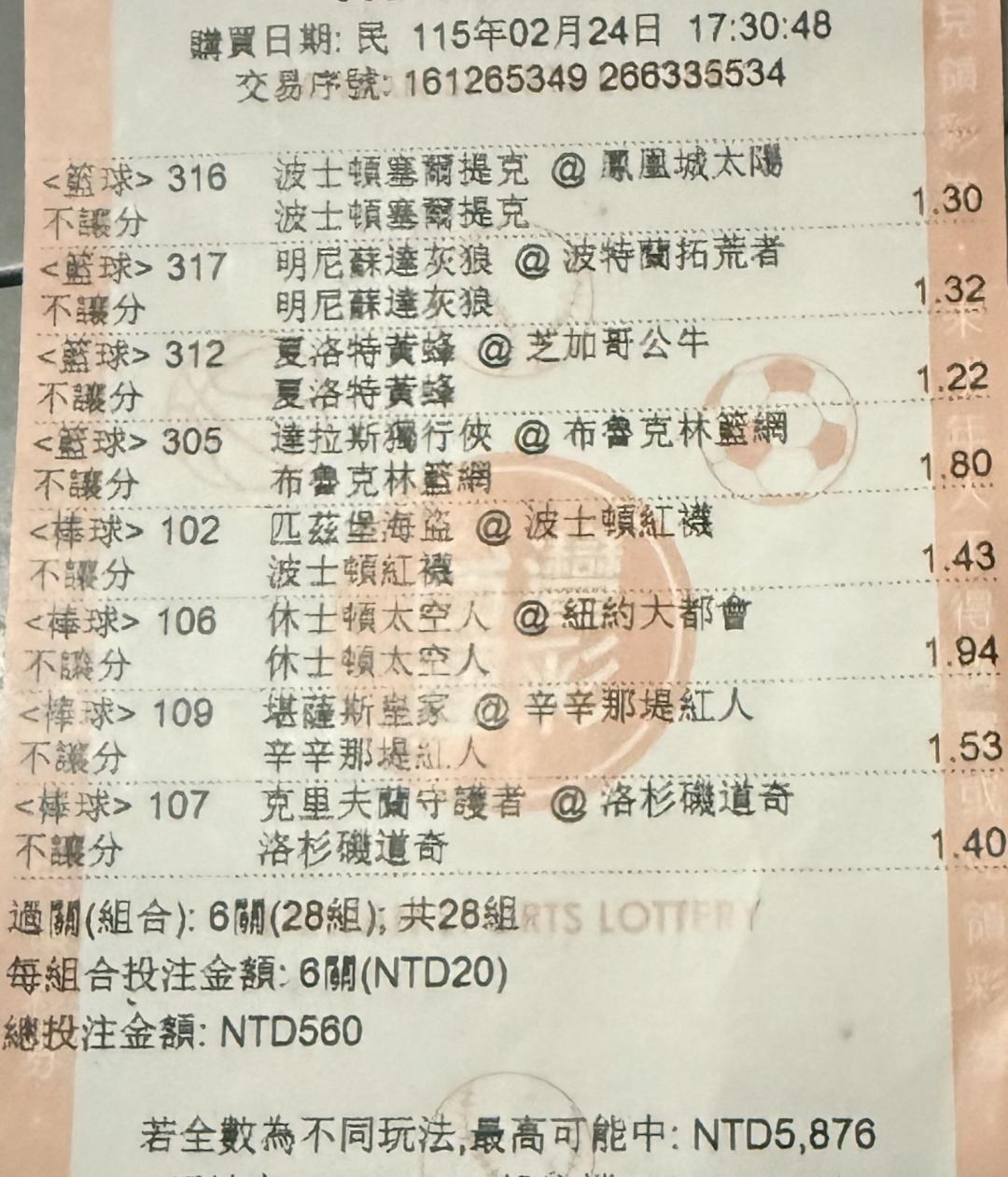 基本運彩都是電腦秒算不會有錯誤的問題 你下次可以買10元然後所有組合都買過兩關到過八關,因為最少要串兩場 |