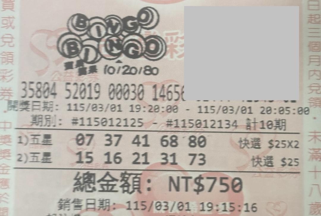彩球 >> 賓果宇宙之神降臨…5中5 兩倍 收大米💰💰