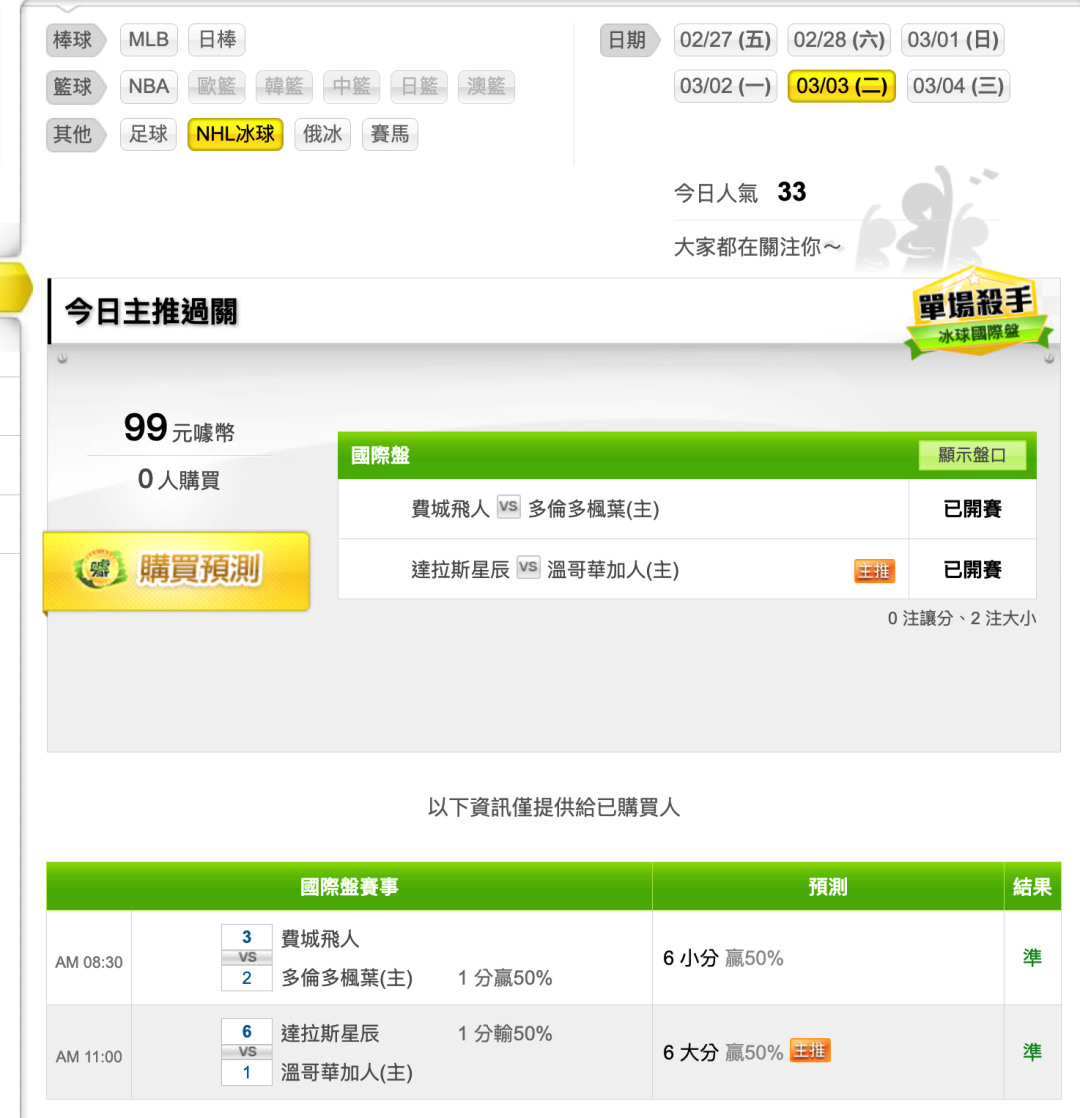 NHL冰球 >> 🏒量身打造,今日二過二