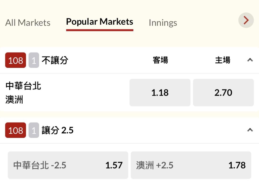 國際棒球 >> $$3/5 中華台北 @ 澳洲。開盤