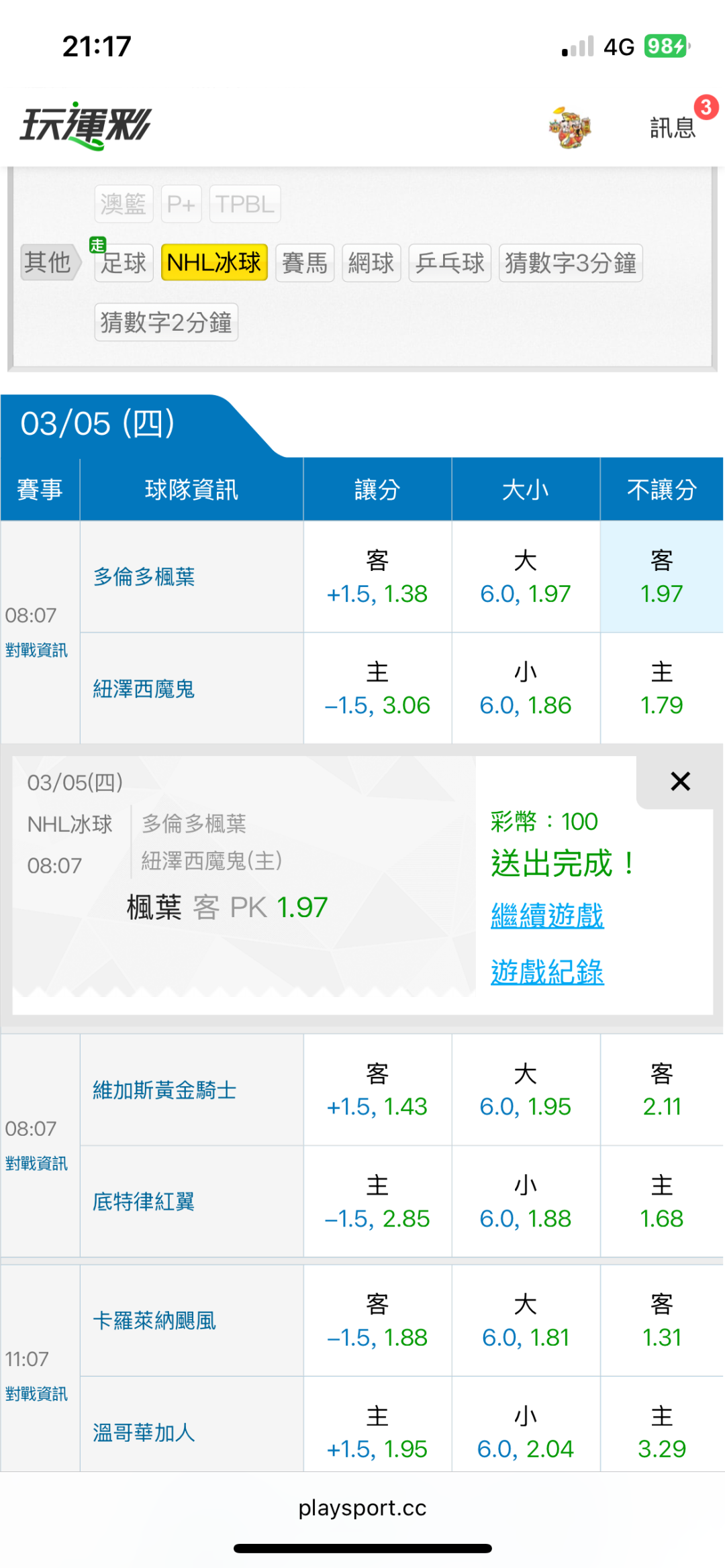 NHL冰球 >> 3/5東台NHL國際盤【近14日贏13日】【近14日58過44】主推信心滿滿(貓場)特價79~