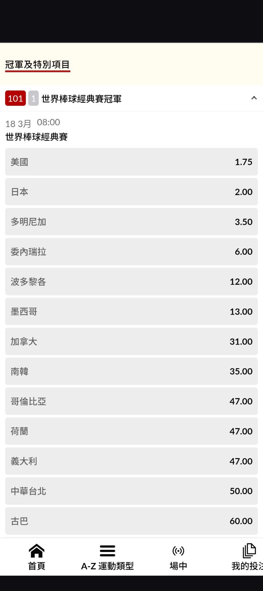 經典賽 >> 有經典賽的冠軍賠率排名嗎?可否提供一下,,,,