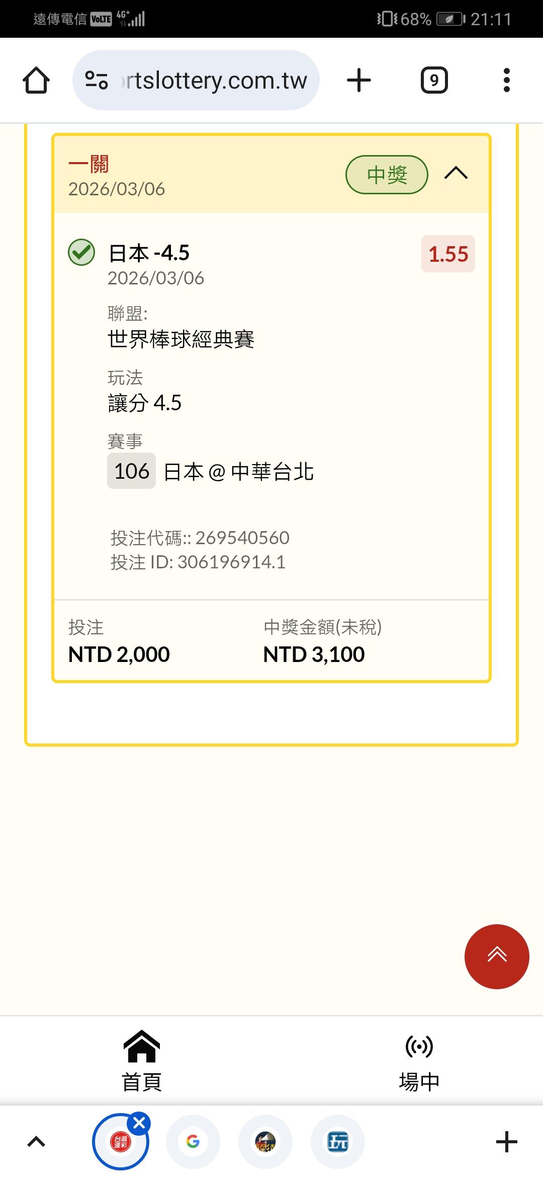 真的太穩了,爽賺耶,開心開心,祝大家這次WBC都賺飽飽😁👍