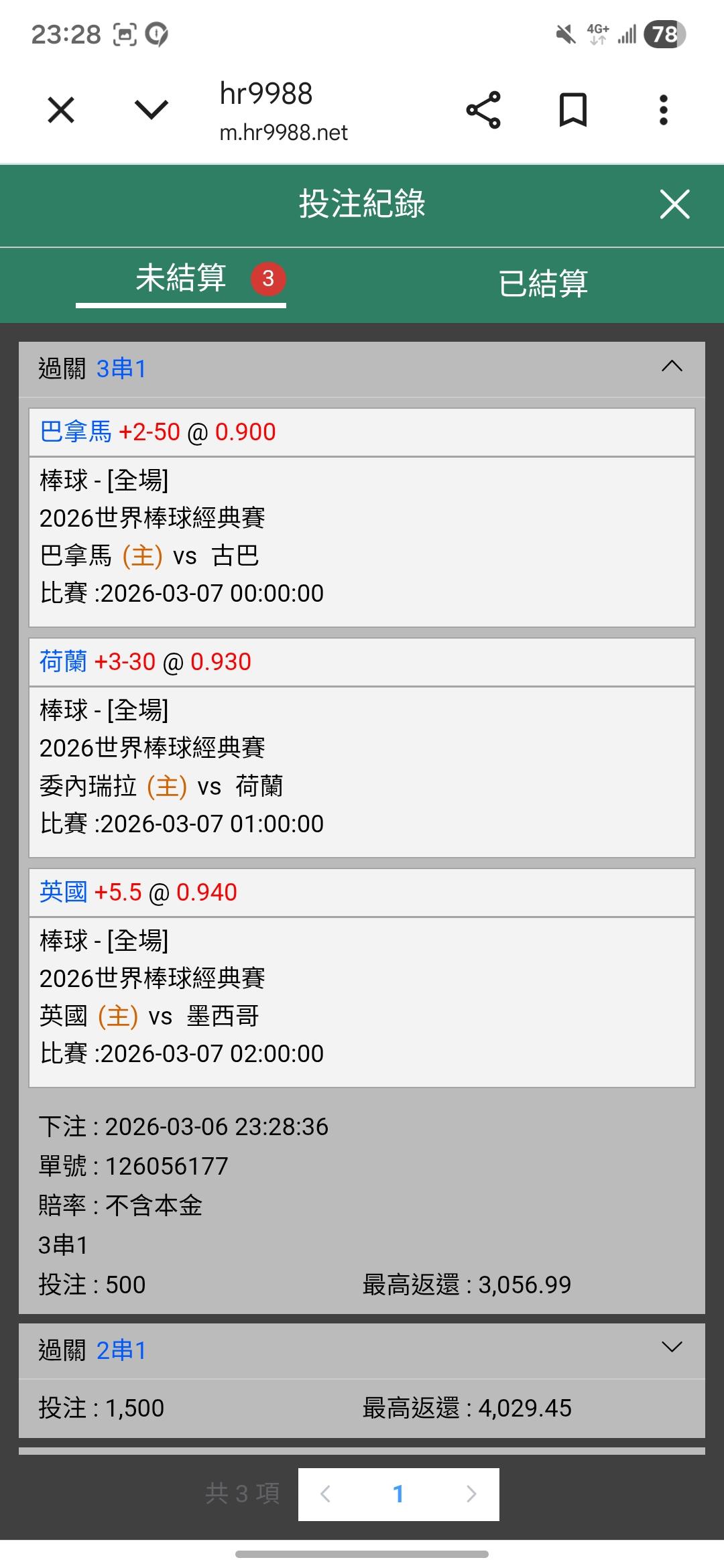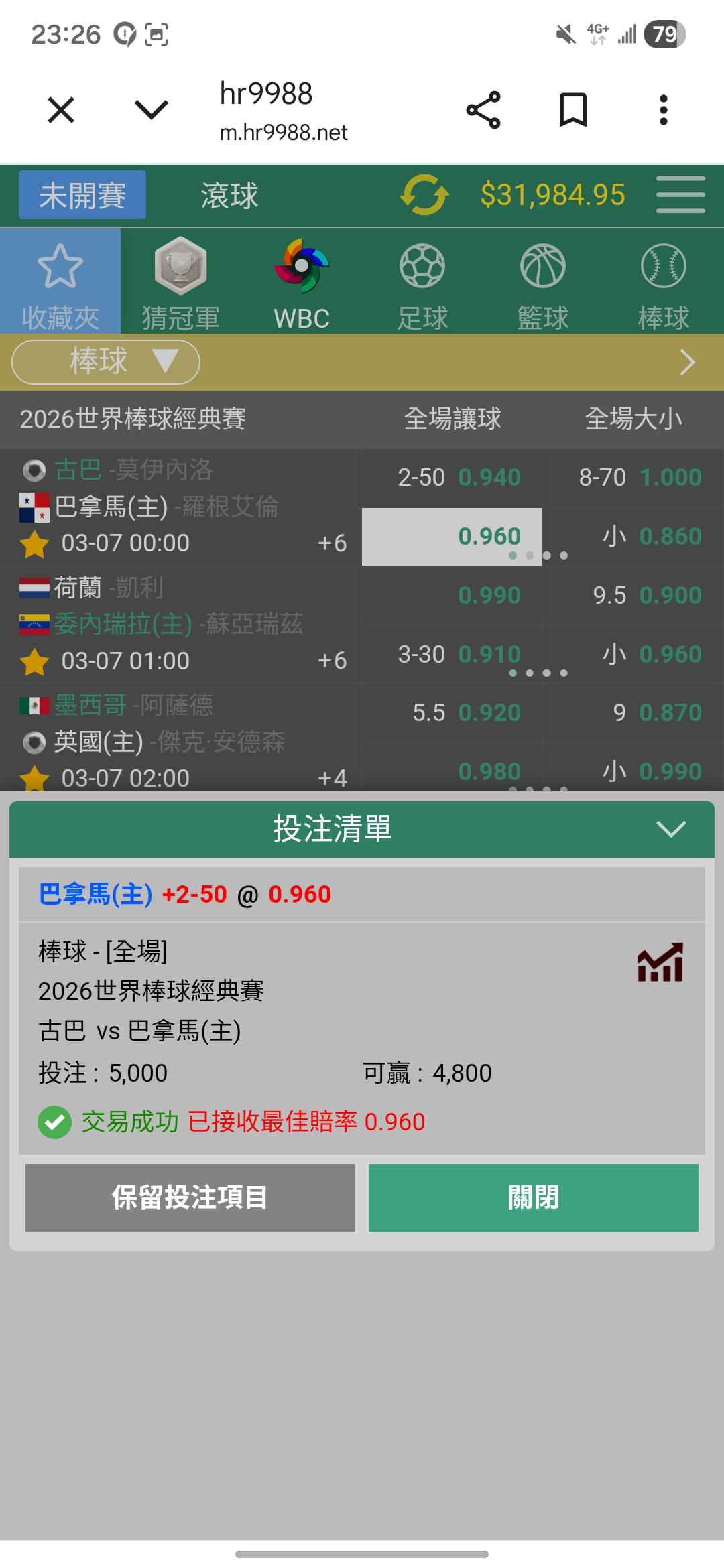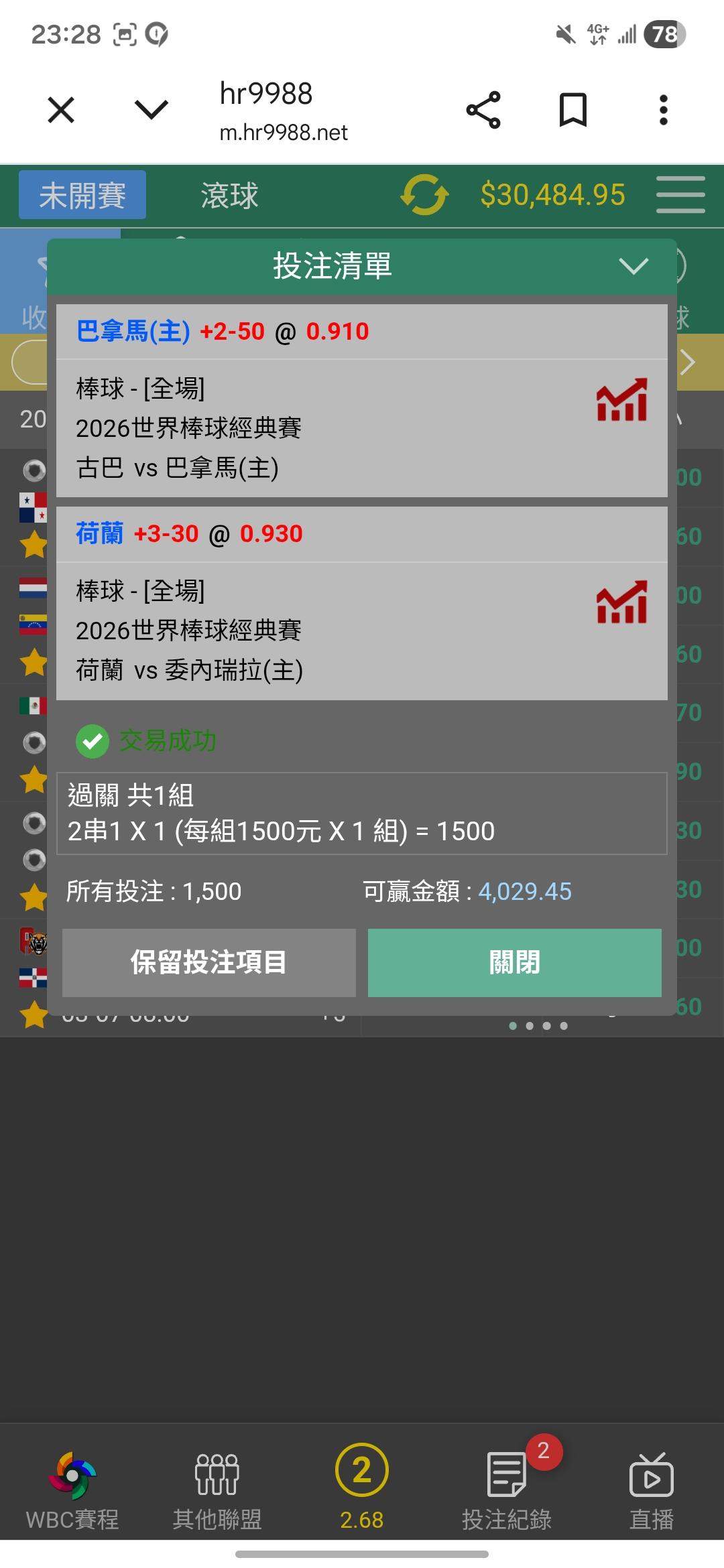 國際棒球 >> 3/7 半夜經典賽三場,受讓三場過盤,7000元