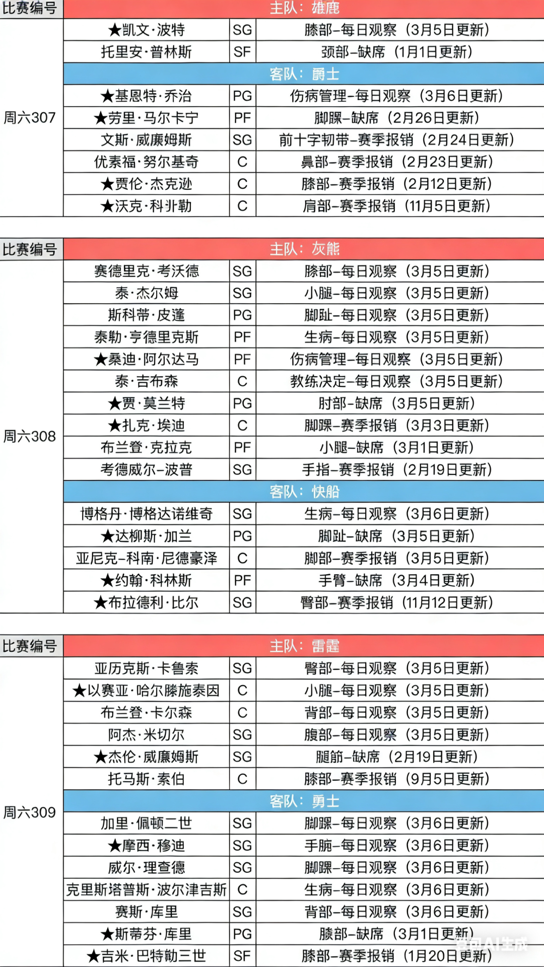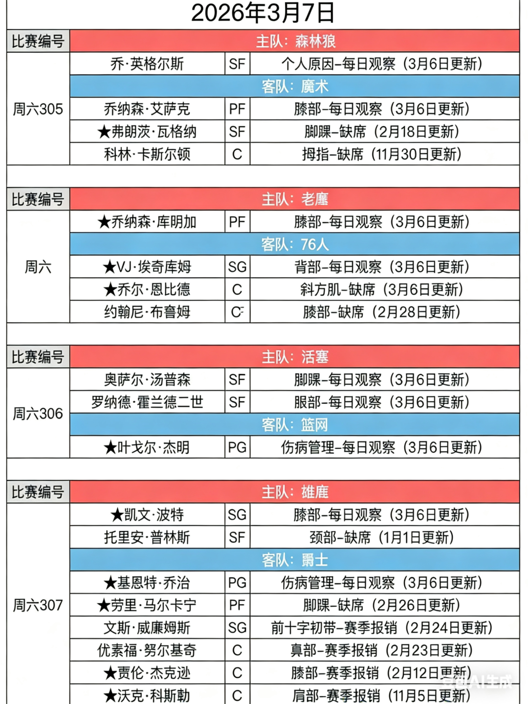 NBA >> NBA今日独家重点分析!伤病!热度!Ai模型 (重点分析已更新)