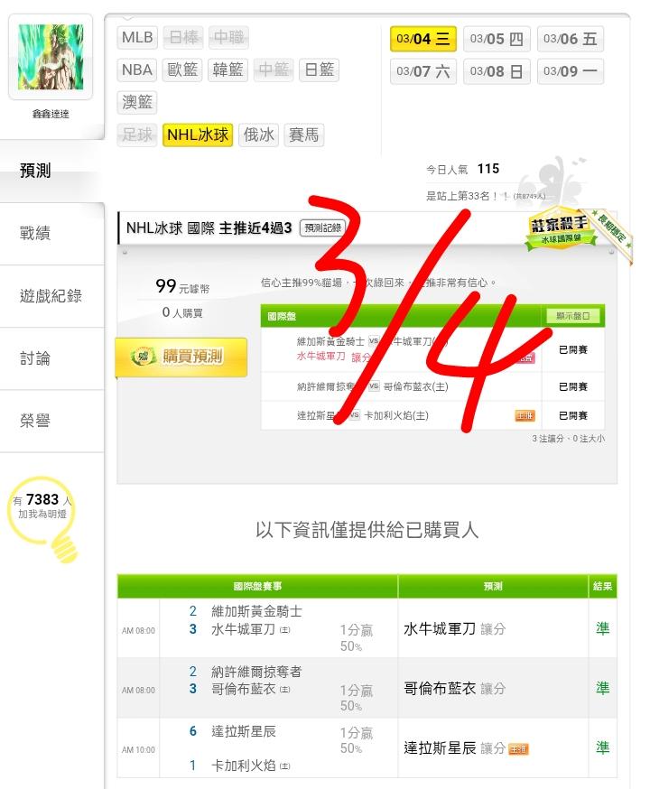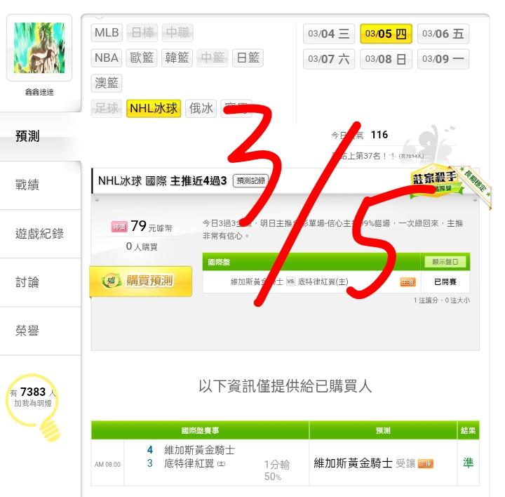 NHL冰球 >> ⭐⭐又贏錢了,連贏2天4過4,主推近4過3,明日信心主推99%貓場,一次綠回來,主推非常有信心。