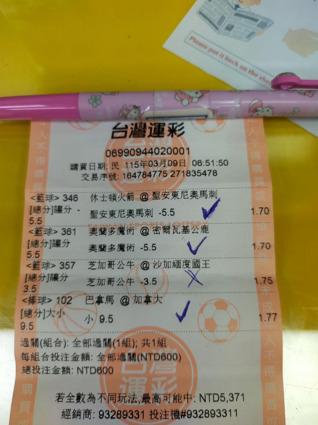 今天早上出門買的這4場球賽結果真可惜倒在公牛,原本想要買拓荒的買錯了,然後太陽這一場第二節買太陽有過一點點,說真的公牛真的太爛