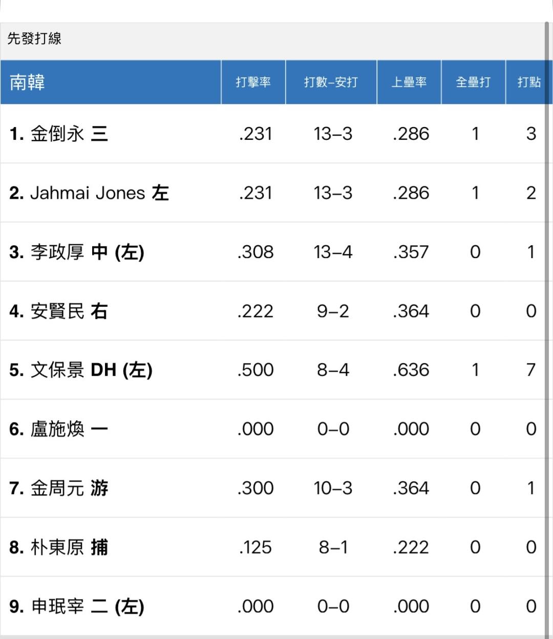 泡菜先發打線前幾棒上壘率應該頗低,就算打到應該很多機會內滾,想尻大棒成份多,除了文保景以外,若前面打線士氣就被打掉,應該後面就沒什麼壓力!