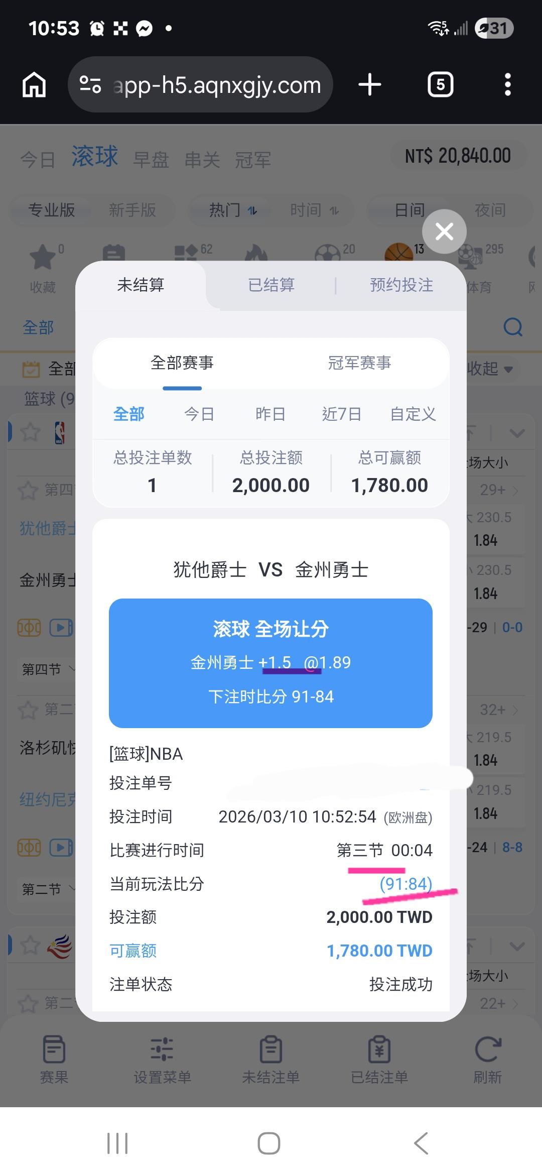 >> 賽後檢討爵士勇士84:91第三節滾球勇士才加1.5,差7分,確實第四節有超前,讓分盤開的不漂亮