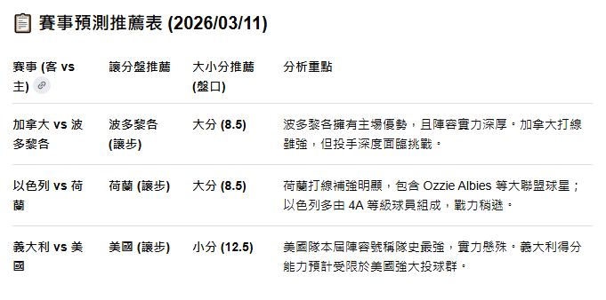 國際棒球 >> 3/11 早上三場 AI推薦 歡迎反壓