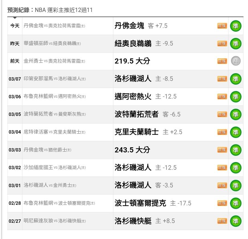 >> 運彩主推【近13日過12】~近12天贏11天【29過23】