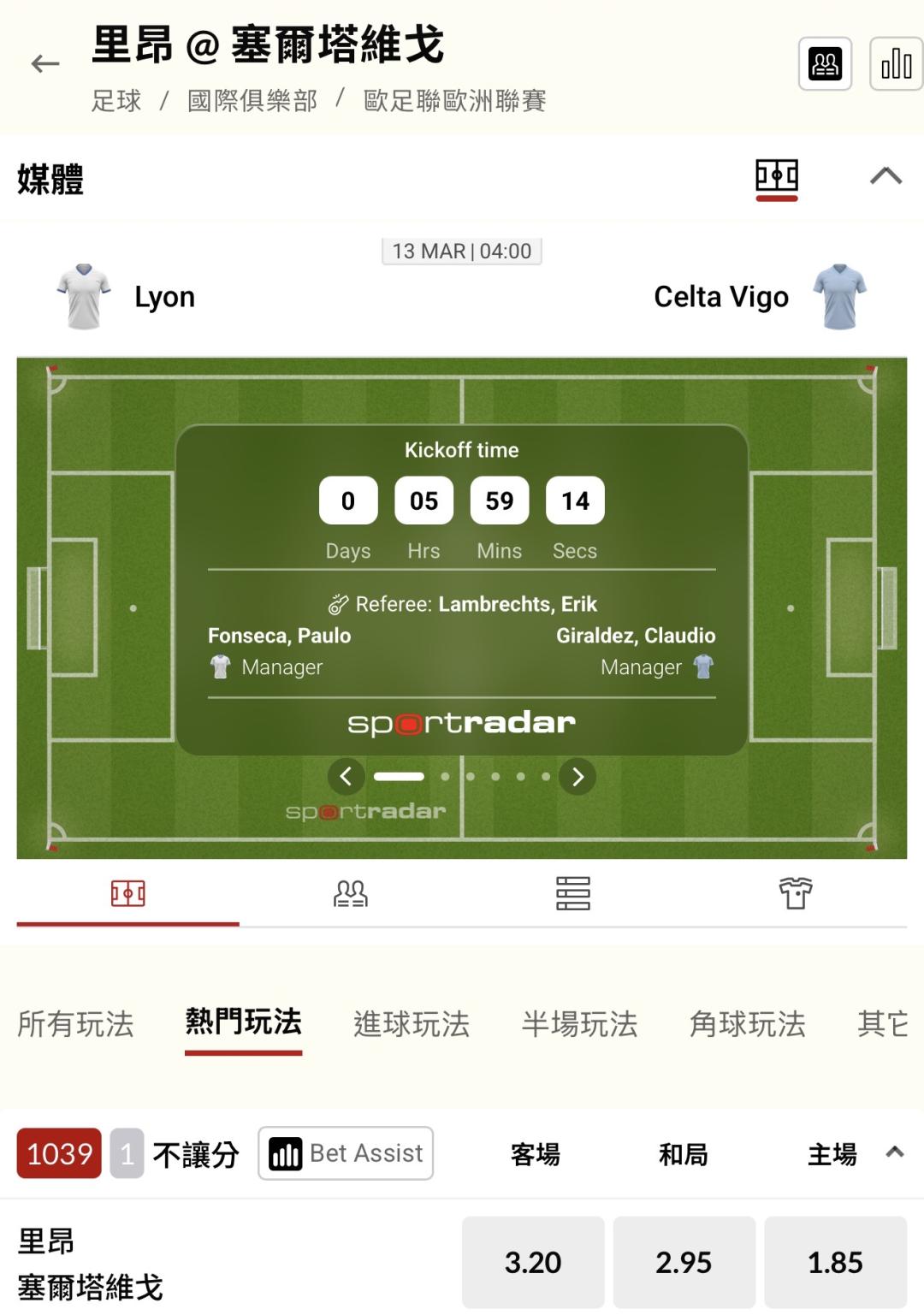 足球 >> 半夜歐足聯「單場 新台幣 10萬」里昂 @ 塞爾塔維戈,真實下注輸贏同在,我陪你