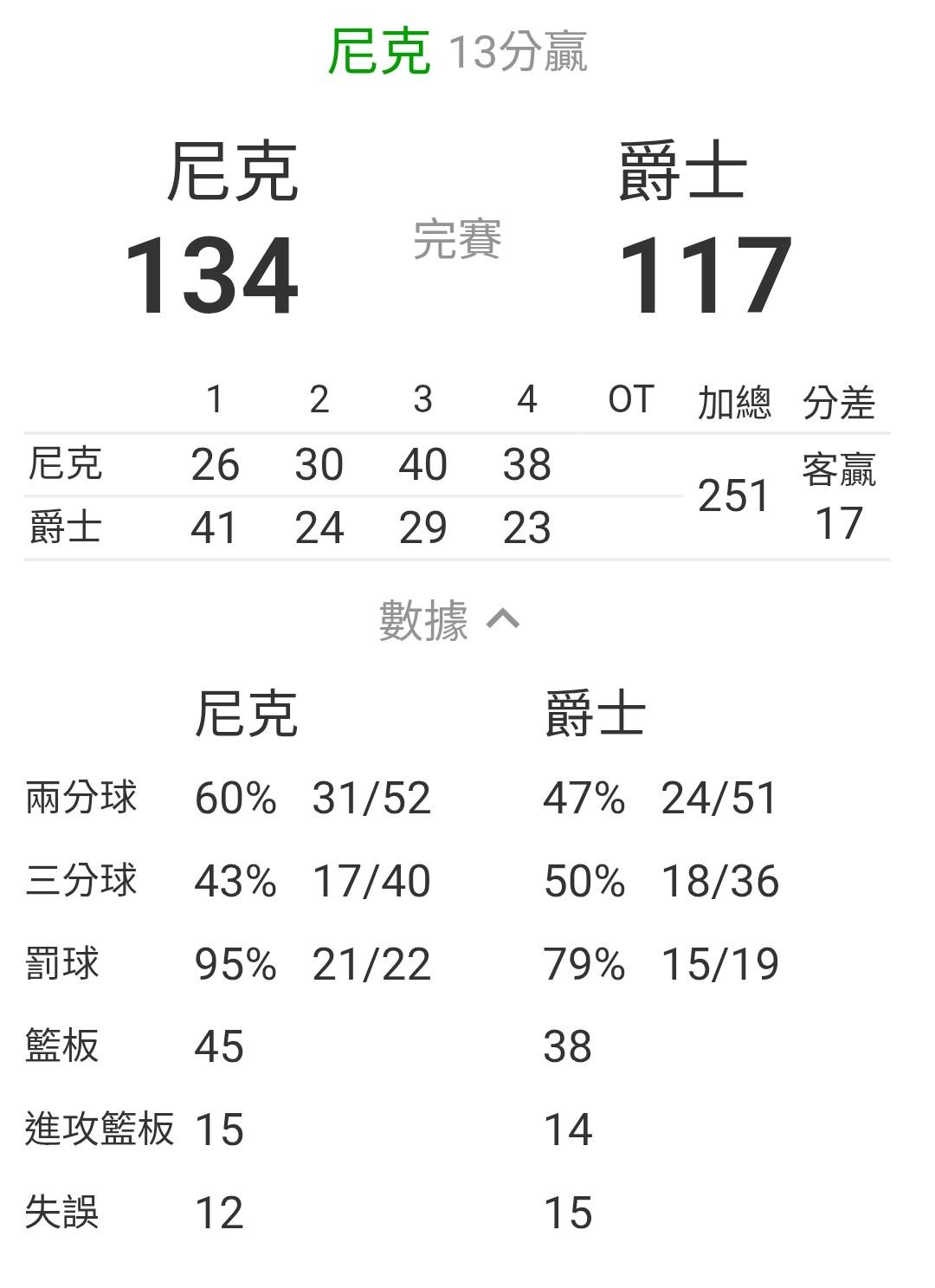 請看圖 尼克上一場 以134分 打贏了爵士的117分 贏了17分