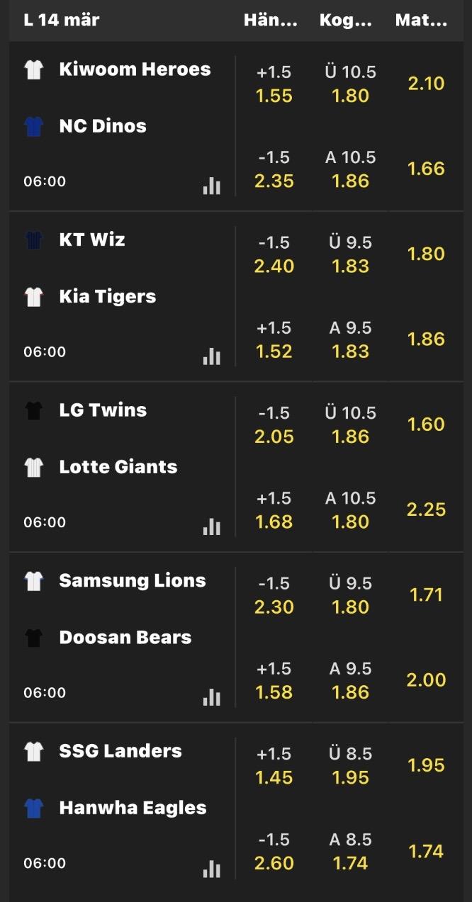 韓國職棒 >> 2026.03.14 韓棒KBO 盤口