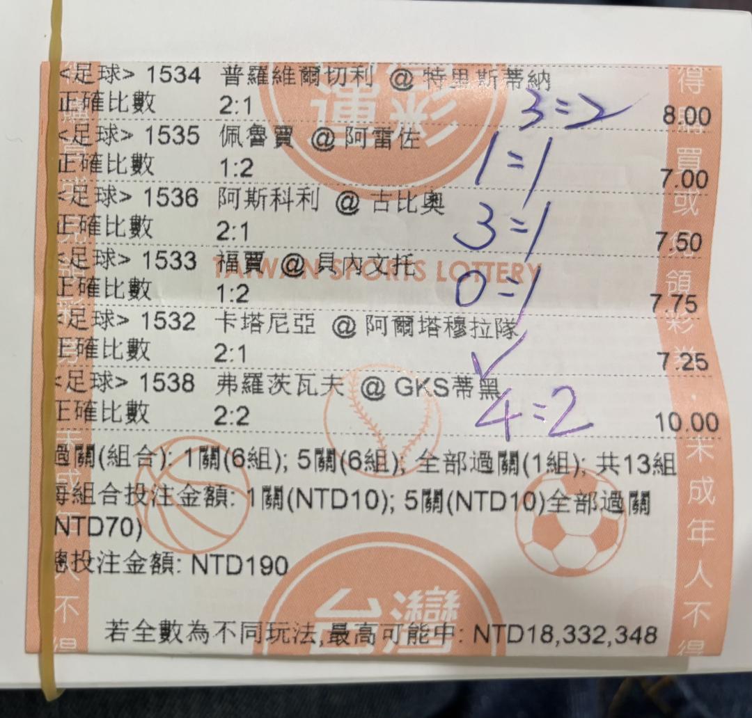 剛好1:0、1:1、2:1、3:1、3:2、4:2各一場