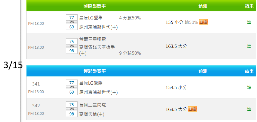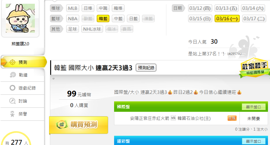韓國職籃 >> 3/16國際盤/大小 連贏2天3過3💰昨日2過2💰信心繼續連莊💰沒過隔日免費💰