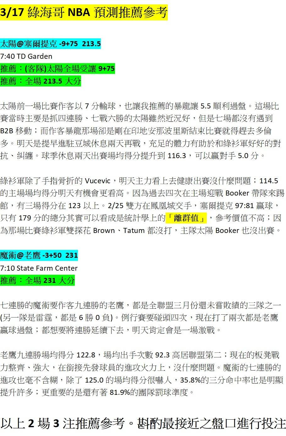 NBA >> 3/17 綠海哥NBA三注預測參考。單純分享,輸贏自負。(留言無回覆,見諒)