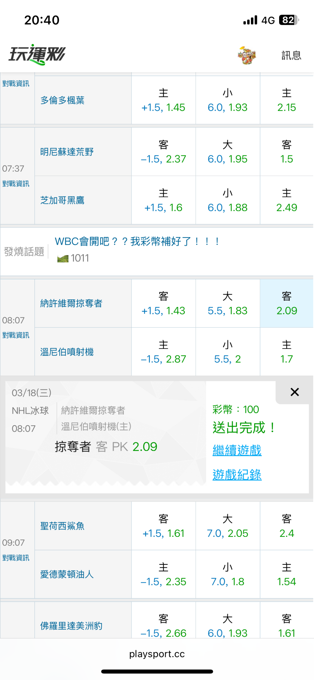 NHL冰球 >> 3/18東台NHL國際盤【主推近11日過10】【近11日贏10日】主推信心滿滿(貓場) 特價79~