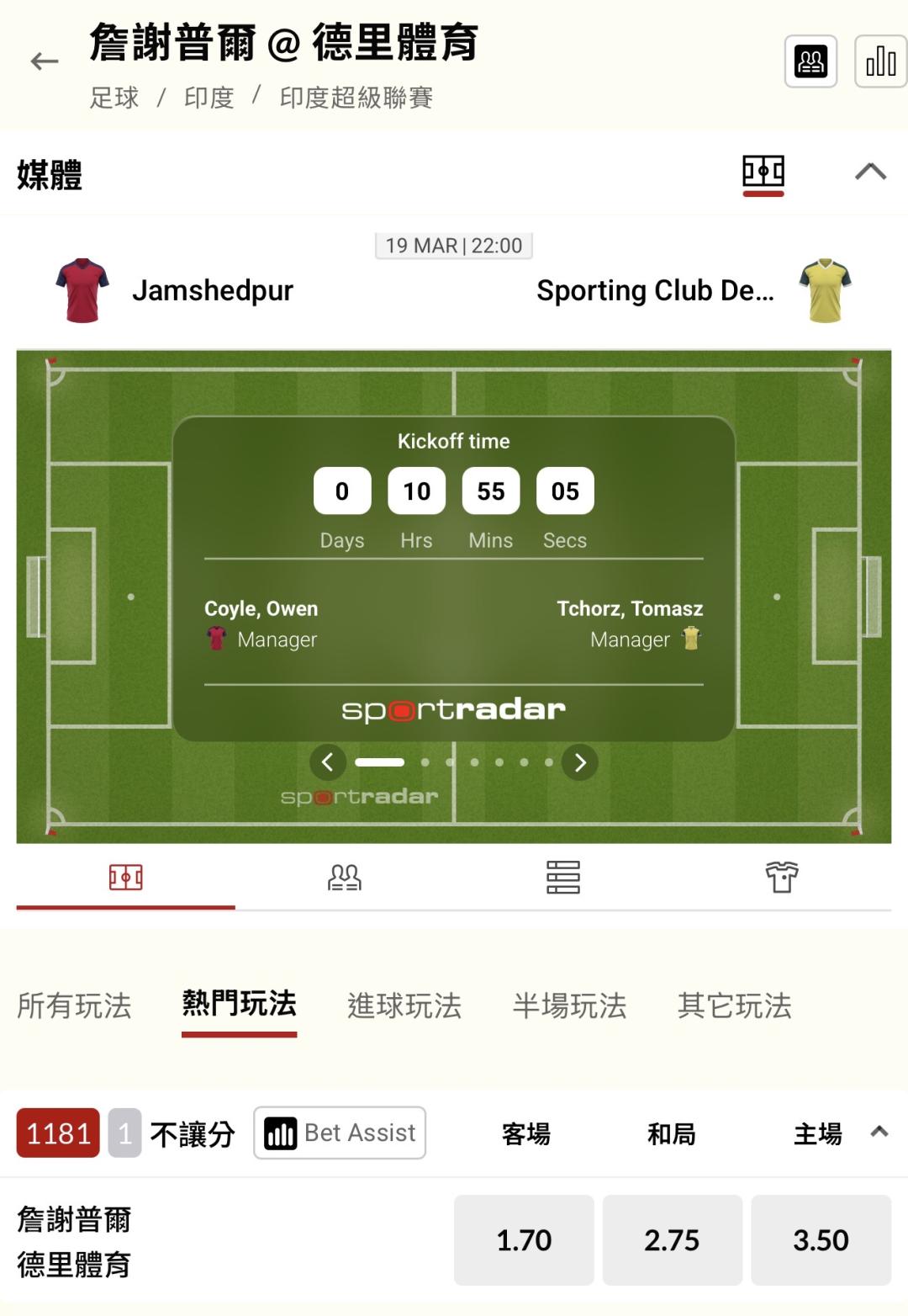 足球 >> 今晚印超「單場 新台幣 10萬」詹謝普爾 @ 德里體育,今晚我來虐足球