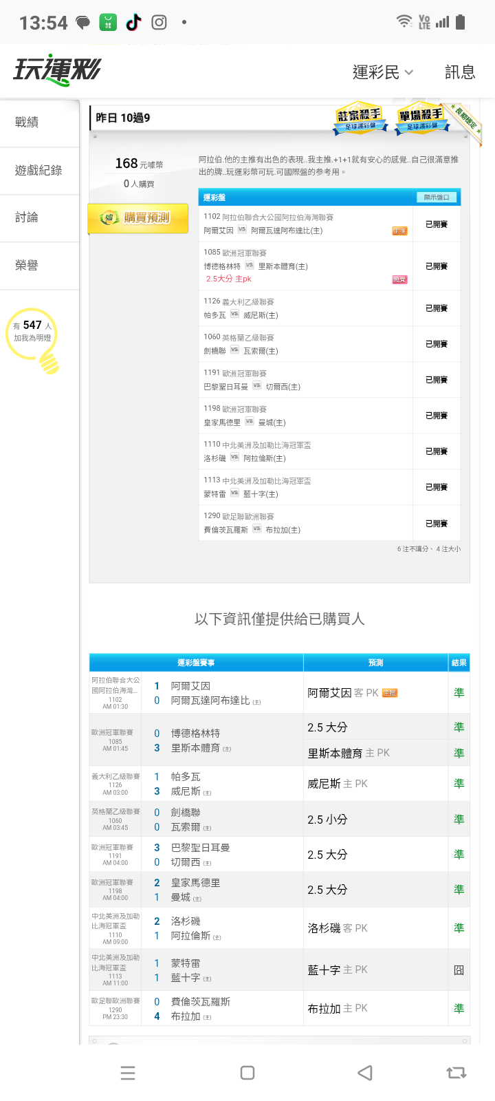 昨天10過9關..差的那關在最後關頭被追平的..可惜.不然就是10....沒關係丫今天也大比數的過關..有叫你們不要不信x..賠率又很捧可運彩幣玩單注..沒人聲進去。