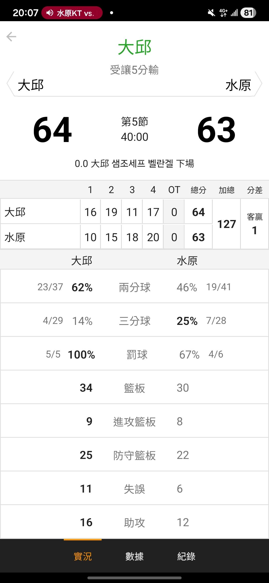 韓國職籃 >> 水原落後10分還開讓1。訊號要逆轉過盤喔