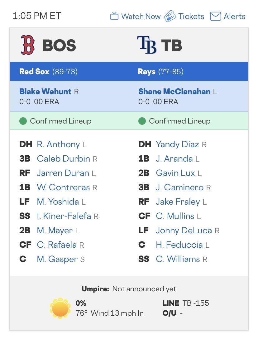 光芒的 Yandy Díaz (1棒) 如果能先上壘,光芒 3、4、5 棒的威脅會成倍增長。紅襪的新秀 Wehunt 能撐過前兩局不掉分?(個人覺得難度很高!)