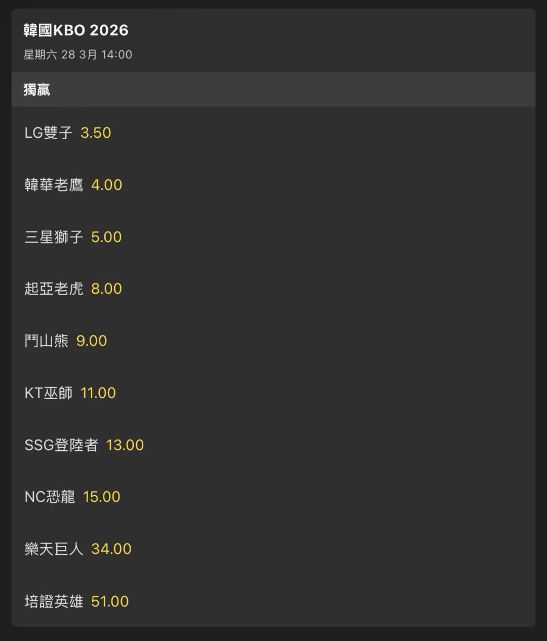 >> 韓棒(國際盤)總冠軍賠率(初盤)