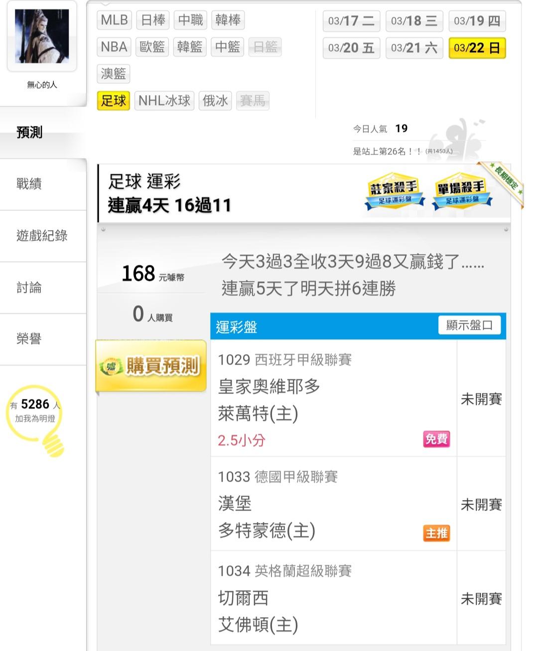 足球 >> 今天3過3全收:3天9過8……連贏5天了明天拼6連勝