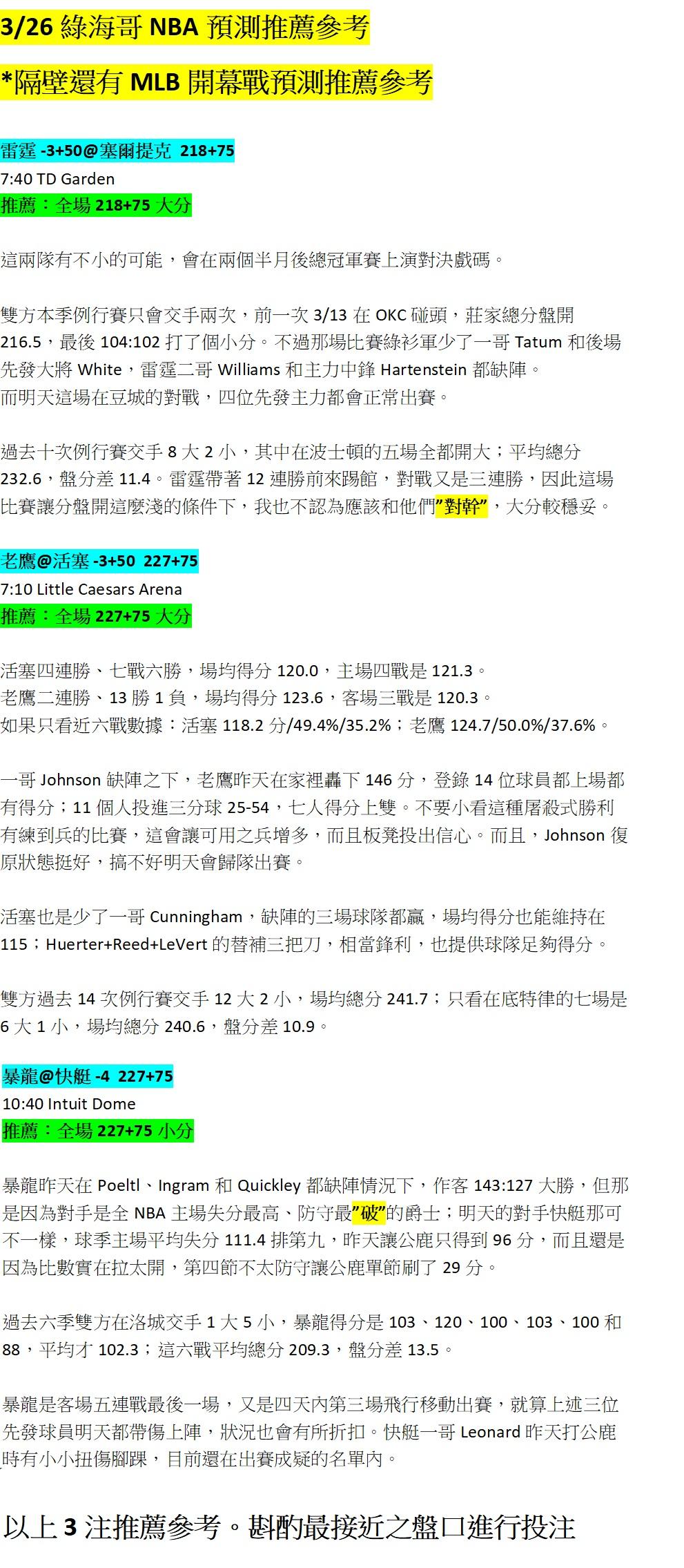 >> 3/26 綠海哥NBA三場預測參考。單純分享,輸贏自負。隔壁還有MLB(留言無回覆,見諒)