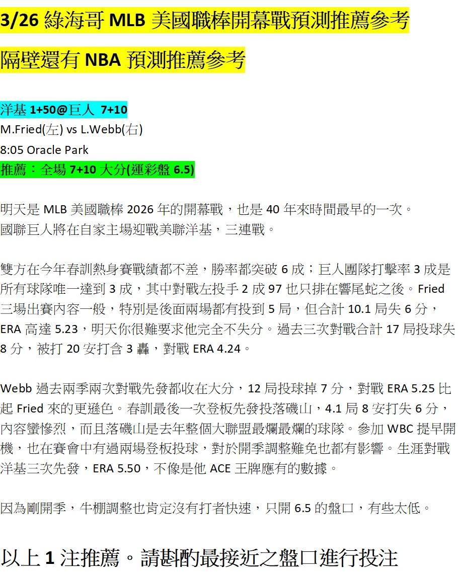 >> 3/26 綠海哥MLB開幕戰預測參考。單純分享,輸贏自負。隔壁還有NBA(留言無回覆,見諒)