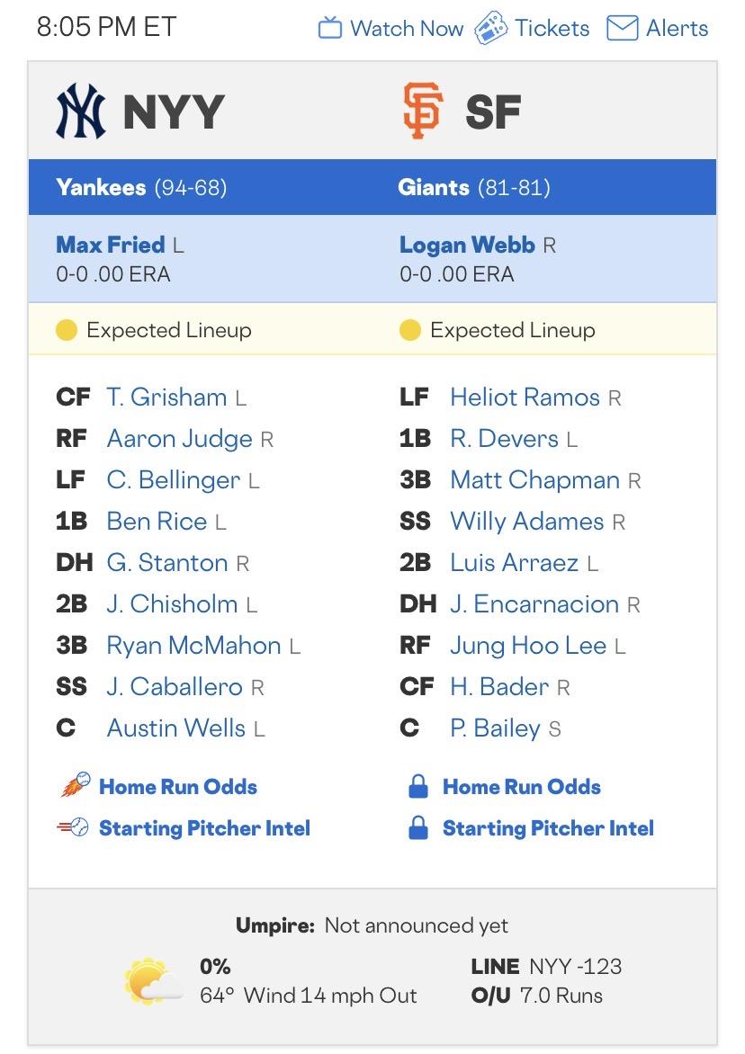 氣溫與風速 (64°F, 14 mph Out): 雖然是往外吹的風,但舊金山海邊的重空氣對「長打型」球隊(洋基)較不利。