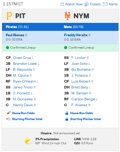 Peralta不用期待他投多長,五局及格,六局出乎意料,後面交給牛棚。大都會的牛棚還是相對海盜堅強。而Skenes則是期待他投最多六局,後面交給海盜不穩的牛棚,在這樣一定得打出勝負的比賽中,如果運氣真的不錯,戰局往預估的走勢走,那我還是選擇推薦主場,打線擺開很美,陣容深度也更佳的大都會全場讓分過盤。