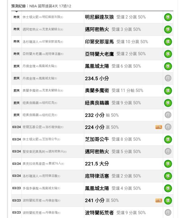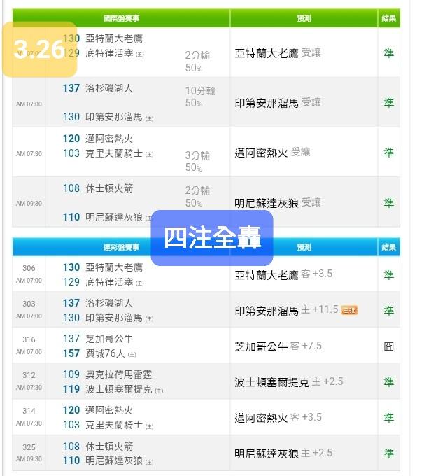 >> 全轟~國際4注全過【國際連贏4天17過12】~本季國際盤總勝率、讓分雙第一!