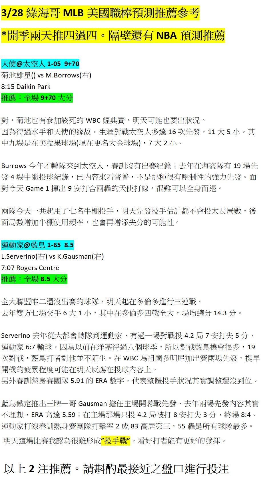 >> 3/28 綠海哥MLB兩場預測參考。單純分享,輸贏自負。開季推四過四(留言無回覆,見諒)