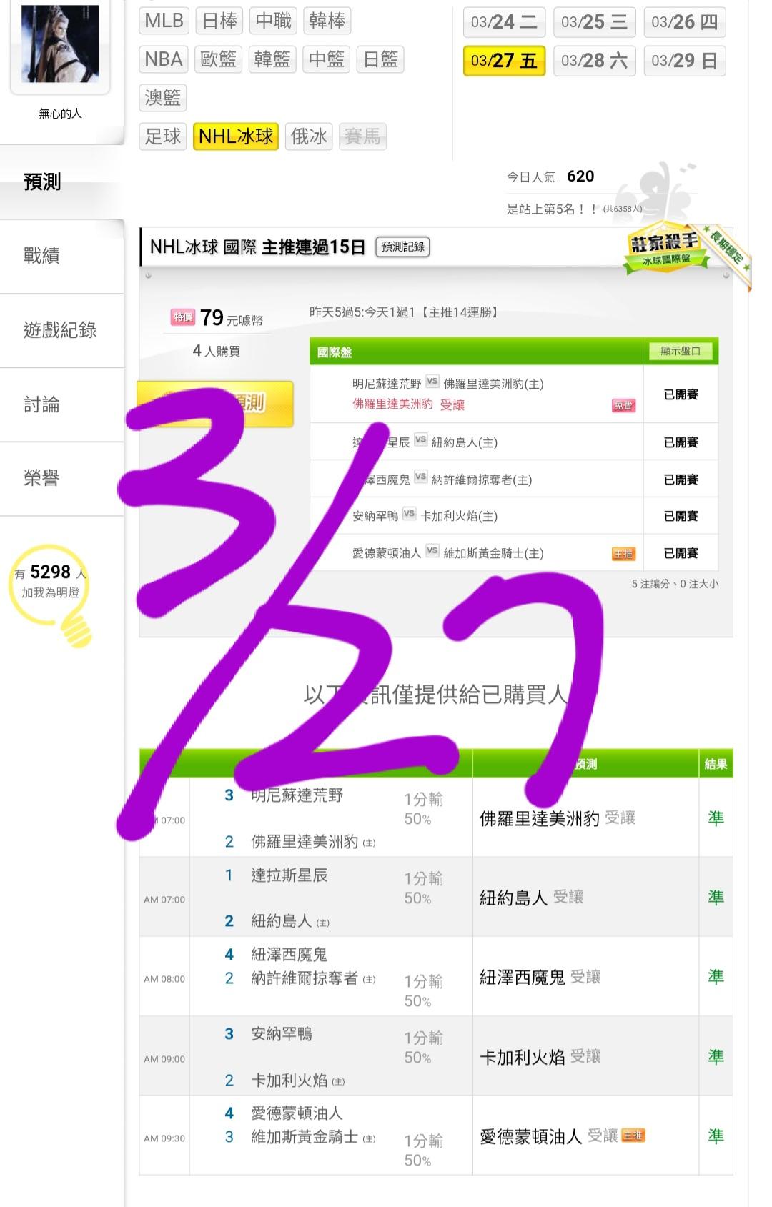 NHL冰球 >> 【主推15連勝】昨天5過5滿貫全壘打