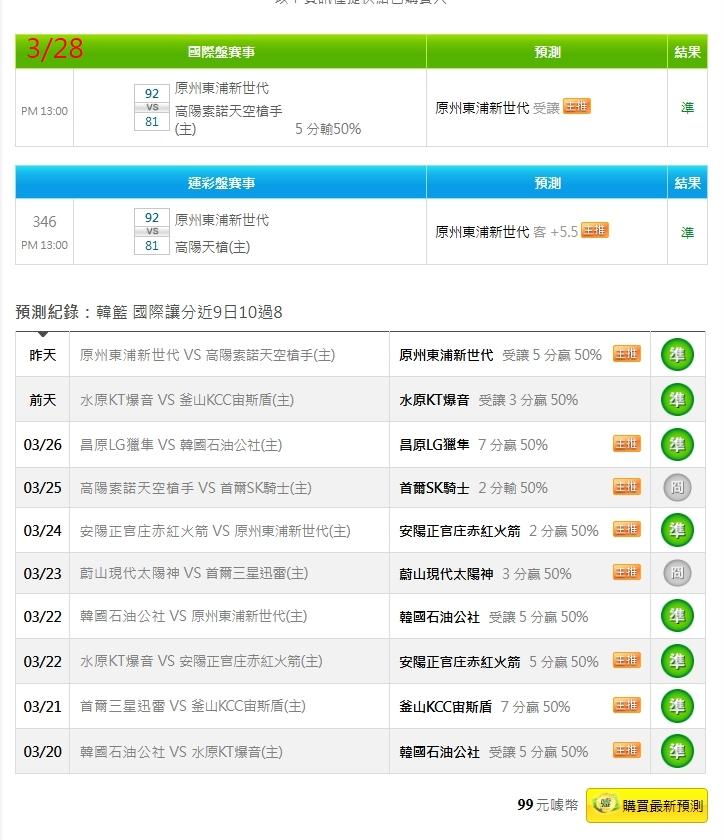 韓國職籃 >> 3/29韓籃國際讓分近9日10過8 昨天雙盤2過2全過 本期最後1次特價販售給支持的朋友