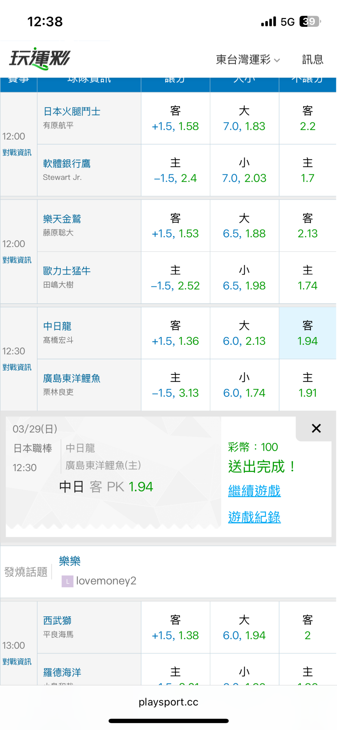 >> 3/29東台日棒運彩【連贏2天6過4】【主推連過2日】特價79-拼日棒運彩連贏3天~